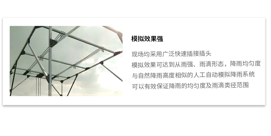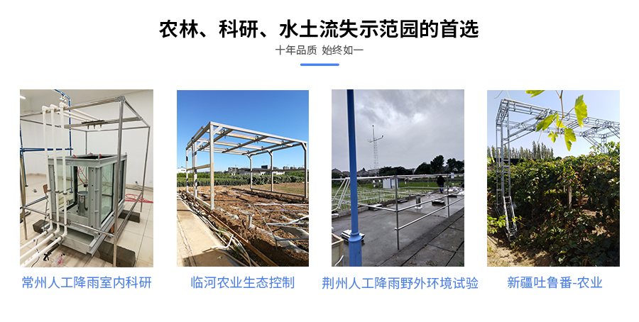 人工模拟降雨装置为组合式结构,安装拆卸迅速,运输方便,性能稳定,控制系统反应灵敏,喷射距离可调,雨强、雨滴动能、雨滴大小分布(中数直径)等降雨特征值与天然降雨特征值基本一致,早在20世纪60年代,美国就开始研究人工降雨模拟技术,开发了各种降雨模拟技术,如喷雾、喷雾、旋转等,降雨面积从0.5m2到50m2。